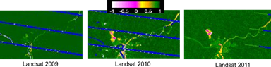 The Normalized Difference Fraction Index (NDFI) is a method of spectral mixture analysis successfully applied in the Brazilian Amazon to identify and distinguish forest degradation caused by selective logging and forest fires associated with other natural disturbances. The potential of this technique was tested in both study countries.