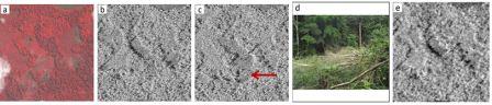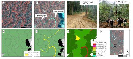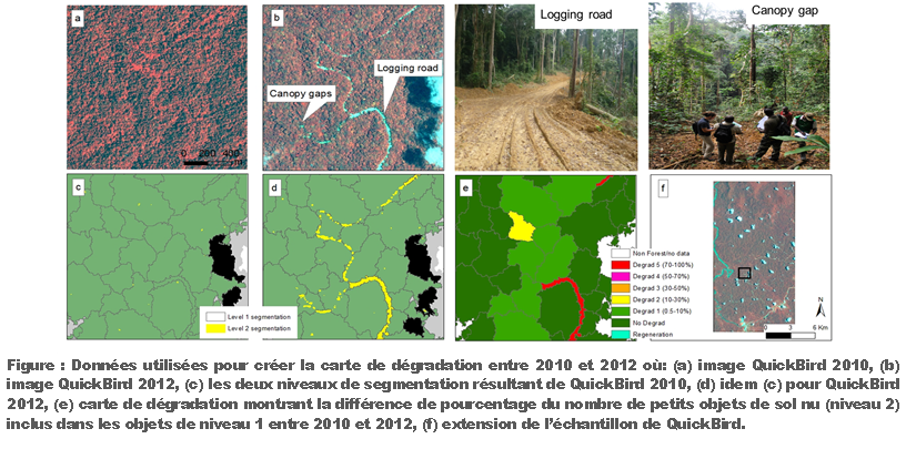 Based on very high resolution data, the object-based classification and multi-date segmentation techniques were tested to provide a system for monitoring small forest degradation features (< 1ha) and evaluating the rate of forest degradation. The figure c and d below show the two levels of segmentation created respectively for 2010 and 2012 to detect forest degradation. Level 1 objects (large objects) aggregate small degradation features information to highlight five level of forest degradation whereas smaller level 2 objects show the extent and the exact location of these small features. Figure e illustrates the level of forest degradation for each large object between 2010 and 2012.