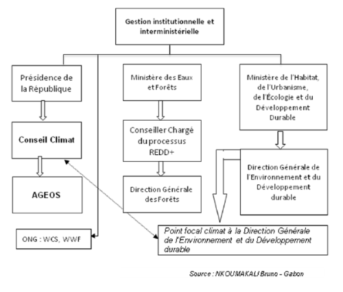 REDD in Gabon is the responsibility of Climate Focal Point (to the UNFCCC) which takes place at the General Directorate of Environment, which depends on the Ministry of Housing, Town Planning, Ecology and Sustainable Development. This focal point is responsible for program execution on climate change funded by the UNDP on the inventory of greenhouse gas (IGES). Another player involved in the management of REDD in Gabon is "Climate Council", under the supervision of the Presidency of the Republic.